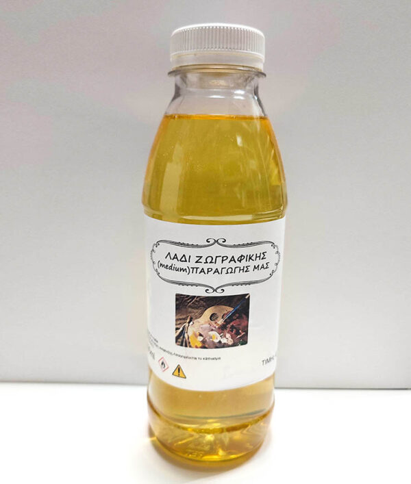 Λάδι Ζωγραφικής δικής μας παραγωγής (medium) ,εξαιρετικής ποιότητας. Επιταχύνει τον χρόνο στεγνώματος, βελτιώνει στην υφή και αυξάνει την γυαλάδα των ελαιοχρωμάτων σας, χωρίς να αλλοιώνει τη σύστασή τους. Μπορεί να χρησιμοποιηθεί σε όλα τα στάδια της δημιουργίας του έργου σας. Κατάλληλο για ελαιοχρώματα oil bars και λαδοπαστέλ. Διατίθεται σε συσκευασία 500ml